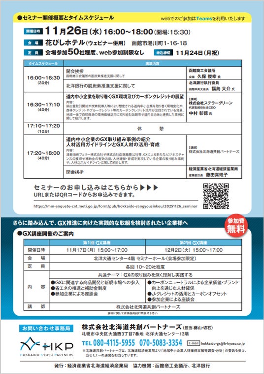 株式会社北海道共創パートナーズ(本社:札幌市、代表取締役社長:岩崎 俊一郎)は経済産業省北海道経済産業局の委託を受け、令和7年度北海道経済産業局における地域中小企業人材確保支援等・分析【事業区分F】の一環として、中小企業が抱えるGX(グリーントランスフォーメーション)に関する課題解決をテーマとしたセミナーの企画運営を行う事となりました。