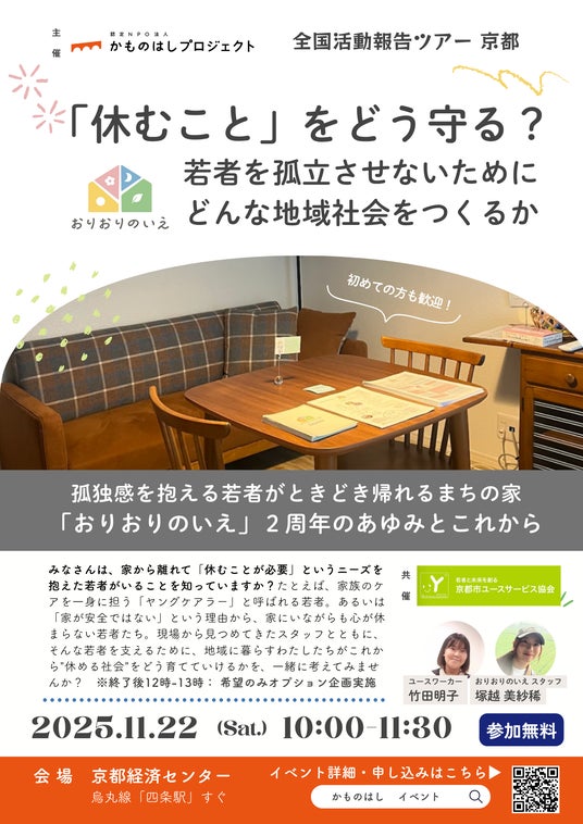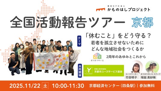 認定NPO法人かものはしプロジェクト(所在地:東京都渋谷区、代表:村田早耶香)は、公益財団法人京都市ユースサービス協会と共催で、2025年11月22日(土)に京都経済センターにて、若者支援の現場から「孤立を防ぐ地域づくり」を考えるイベントを開催いたします。