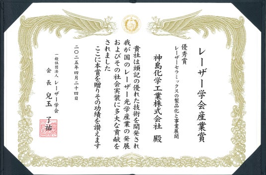 神島化学工業株式会社(本社:大阪市中央区、代表取締役社長:布川明、以下「神島化学」)の透明YAGセラミックスが、この度第17回レーザー学会産業賞(主催:一般社団法人 レーザー学会)にて優秀賞を受賞致しました。