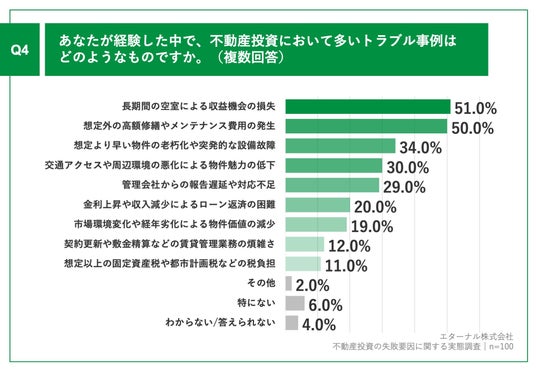 「Q4.あなたが経験した中で、不動産投資において多いトラブル事例はどのようなものですか。(複数回答)」(n=100)と質問したところ、「長期間の空室による収益機会の損失」が51.0%、「想定外の高額修繕やメンテナンス費用の発生」が50.0%、「想定より早い物件の老朽化や突発的な設備故障」が34.0%という回答となりました。