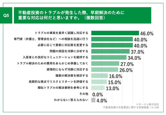 「Q5.不動産投資のトラブルが発生した際、早期解決のために重要な対応は何だと思いますか。(複数回答)」(n=100)と質問したところ、「トラブルの事実を素早く認識し対応する」が46.0%、「専門家(弁護士、管理会社など)への相談を迅速に行う」が40.0%、「必要に応じて柔軟に対応策を変更する」が40.0%という回答となりました。