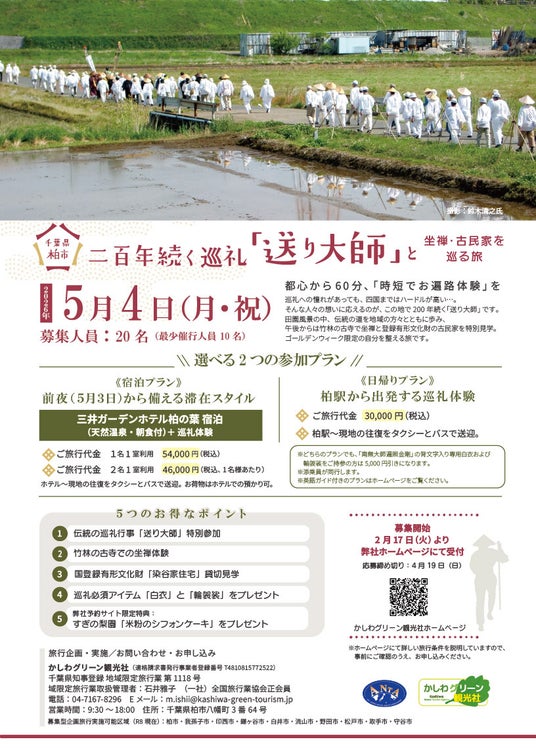 千葉県柏市を中心とする東葛地域では、四国遍路を模した200年続く伝統行事「東葛印旛大師(送り大師)」が今も大切に守られています。地域密着型の旅行企画を行う、かしわグリーン観光社は、この伝統行事に特別参加し、1日で心身をリセットできる「自分を整える旅」を2026年5月4日(月・祝)に開催いたします。