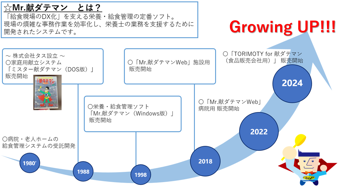 『Mr.献ダテマン』は1980年代前半に、女性起業家が病院や高齢者施設の給食管理を効率化するために開発したプロトタイプからスタート、『Mr.献ダテマン』DOS版はその後Windows版へと展開。2000年以降は関連システムも次々リリースし、機能の幅を広げていきました。さらに2018年には業界に先駆けてクラウド版を発表し、リモートワークやDX化を推進。40年以上にわたり進化を続ける同シリーズは、全国の食の現場を支える最も選ばれる定番の給食システムとして、確固たる地位を築いています。