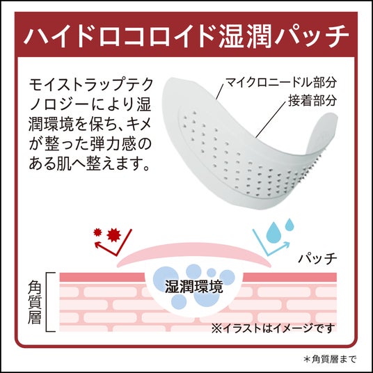 ハイドロコロイド湿潤パッチを採用。角質層への美容液成分の浸透*1をサポート。モイストラップテクノロジーにより湿潤環境を保ち、キメが整った弾力感のある肌へ整えます。