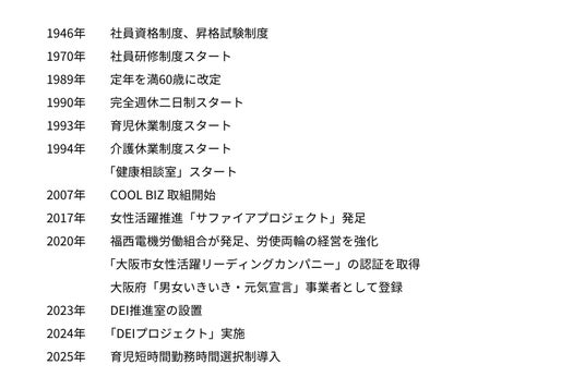 福西電機はこれまで、社会の変化に合わせて制度や体制を整備してきました。2023年のDEI推進室の設置を機に、本格的な取り組みを開始しています。