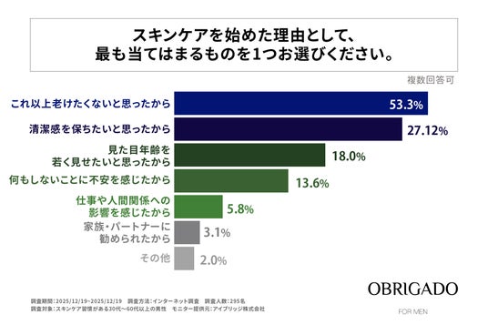 その結果、多くの男性がスキンケアを始めた背景には美容目的だけでなく、「老けたくない」「清潔感を保ちたい」といった年齢に対する不安や自己管理意識があることが明らかになりました。