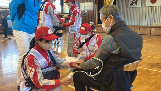全国の赤十字病院などに常時編成され、基本編成は医師1人、看護師長1人、看護師2人、主事(管理要員)2人の計6人。必要に応じて薬剤師や助産師、こころのケア要員を帯同して被災地で活動します。「応急医療」「助産」「巡回診療」「こころのケア」などを担い、被災地の医療機関の機能が回復するまでの空白を埋め、被災された方々に寄り添います。