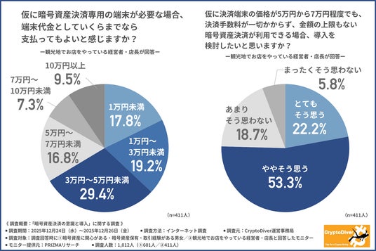 CryptoDiver運営事務局は、1.暗号資産に関心がある・暗号資産保有・取引経験がある男女/2.観光地でお店をやっている経営者・店長を対象に、「暗号資産決済の意識と導入」に関する調査を行いました。