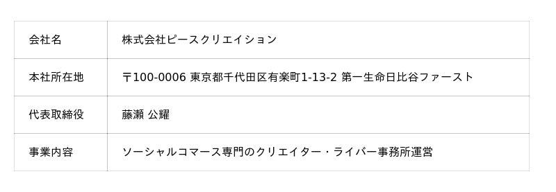 ピースクリエイションは、親会社の株式会社いつも(本社:東京都千代田区、代表取締役社長:坂本守)が13,000件以上のEC・D2Cの総合支援で培ったノウハウと、グループ会社の株式会社ピースユー(本社:東京都千代田区、代表取締役:藤瀬公耀)が提供する日本最大級のライブコマースアプリ「Peace you LIVE」の運営実績や、ライバーとのネットワークを活かした、ソーシャルコマース専門のクリエイター・ライバー事務所です。