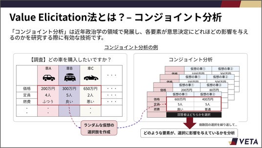 こうした課題に対し、本共同研究では VE 法を用いた新しい調査分析手法を導入します。VE 法は、個人が様々な要素を比較検討しながら意思決定する場面において、その背後ではどの要素を重視して決定を行っているかを定量的に把握する手法です。従来のアンケートのように個別の設問に回答する方式と比べ、各要素が個人の意思決定に与える影響を因果効果として推定可能な点や、社会的な体裁を気にすることが無いことから回答者の本音が表れやすい点などがメリットとして学術的に示されています。