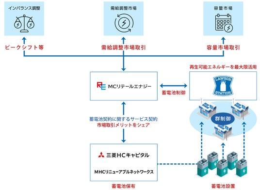 三菱HCキャピタル株式会社(代表取締役 社長執行役員:久井 大樹/以下、三菱HCキャピタル)、そのグループ会社であるMHCリニューアブルネットワークス株式会社(代表取締役:鶴見 仁嗣/以下、MHCリニューアブルネットワークス)、MCリテールエナジー株式会社(代表取締役社長:荒木 敬幸/以下、MCリテールエナジー)、株式会社ローソン(代表取締役 社長:竹増 貞信/以下、ローソン)は、このたび、ローソン店舗のCO2排出量削減および電力の需給バランス調整に貢献すべく、分散型蓄電池を活用したソリューションを展開します。本ソリューションは蓄電池をローソンの店舗に初期費用なしで設置し、運用費用も不要の先進的な取り組みとなります。