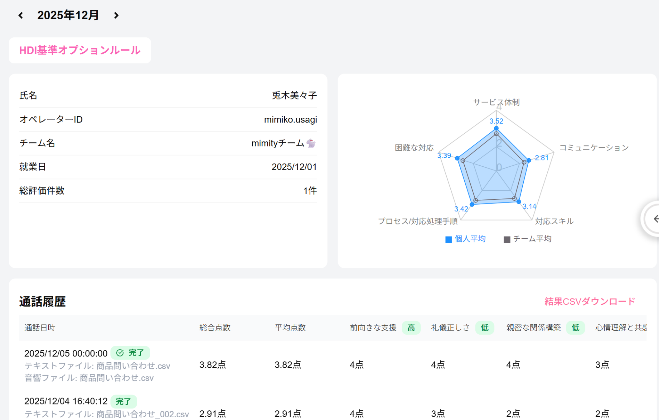 図1 mimityの評価画面「各オペレーター詳細結果」