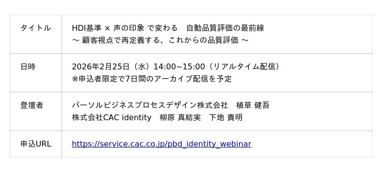 株式会社CAC identity(本社:東京都中央区、代表取締役社長:中西英介、以下「CAC identity」)は、パーソルビジネスプロセスデザイン株式会社(本社:東京都江東区、代表取締役社長:市村和幸、以下「パーソルビジネスプロセスデザイン」)と、2026年2月6日にコンタクトセンター向け通話自動品質評価分野において業務提携契約を締結しました。