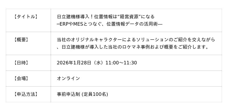 株式会社国際電気(代表取締役 社長執行役員 佐久間 嘉一郎、以下「当社」)は、SaaS型 現場最適化ソリューション「ロケーションマネジメント」(以下、「ロケマネ」)をご導入いただいた、日立建機株式会社(執行役社長:先崎正文/以下、「日立建機」)土浦工場の事例をご紹介するウェビナーを開催いたします。