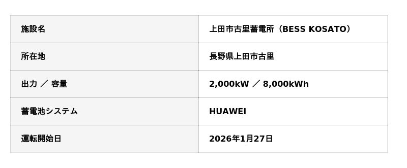 株式会社野村屋ホールディングス(所在地:長野県上田市、代表取締役:野村健太)は、長野県上田市の自社敷地内に設置を進めていた系統用蓄電池システム「上田市古里蓄電所(BESS KOSATO)」について、2026年1月27日に電力系統への接続および受電を開始し、系統用蓄電施設としての運転を開始したことをお知らせします。