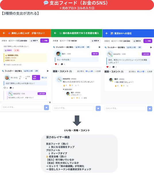 真決DAO「支出フィード」の実画面。お金の使い道を投稿し、共鳴で価値が可視化される。
