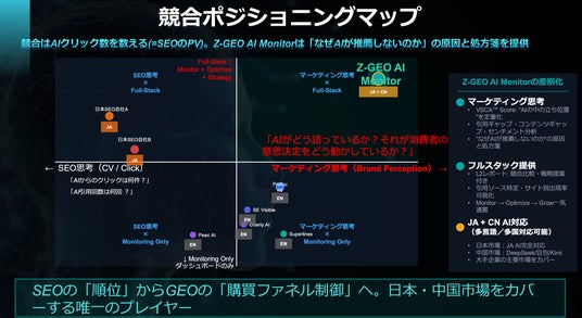 特許出願済アルゴリズム「VSCA(TM)」で測定した業界別AIプレゼンス分析データを公開。AIアンサー内の購買ファネル制御を実現する「Z-GEO AI Monitor」の差別化と競争優位性を解説