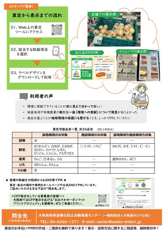 一般財団法人大阪府みどり公社(本部:大阪府大阪市、代表:南部 和人)内に拠点をおく「大阪府地球温暖化防止活動推進センター」は、大阪府版の農産物のCO2見える化ツール「大阪版カーボンフットプリント算定・表示ツール」のホームページをリニューアル公開しました。