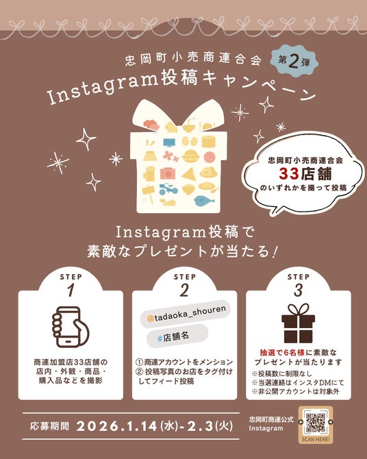 忠岡町内の小売商で構成される団体・忠岡町小売商連合会(大阪府泉北郡忠岡町)では、地域商店の魅力を広く発信し、まちのにぎわいと交流を生み出すことを目的に、2026年1月14日(水)~2月3日(火)の期間で、Instagram投稿キャンペーンを開催しています。