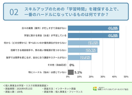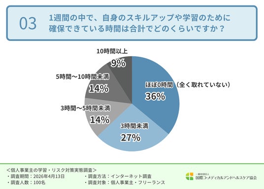 一般社団法人国際コ・メディカルアンドヘルスケア協会(ICHA)(https://icha.jp/)(所在地:神奈川県川崎市、代表理事:飯田 正人)は、個人事業主・フリーランスを対象に「個人事業主の学習・リスク対策の実態」に関する調査を実施しました。