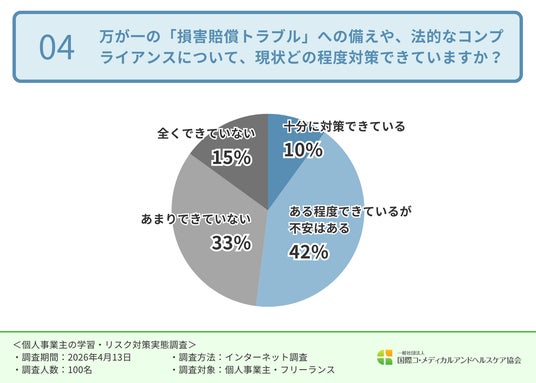 また、損害賠償リスクやコンプライアンスといった「守り」についても、多くの個人事業主が十分な対策を講じられていない状況です。