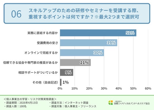 研修選びにおいて「実務に直結する内容」が最も重視されている点は、個人事業主の学習目的が非常に実践的であることを示しています。