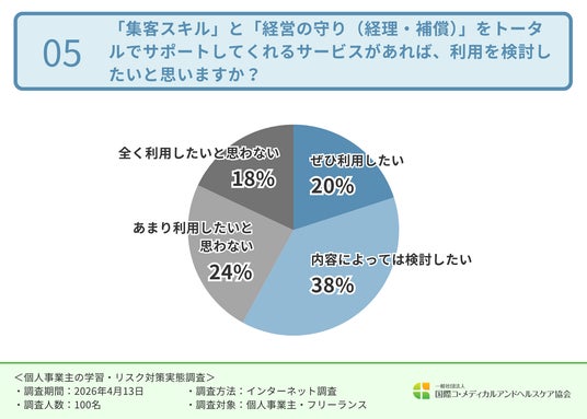 次に、「集客スキル」と「経営の守り(経理・補償)」をトータルでサポートしてくれるサービスがあれば、利用を検討したいと思うか伺ったところ、「内容によっては検討したい(38.0%)」「ぜひ利用したい(20.0%)」という結果となりました。