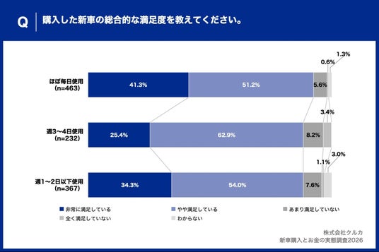 ■総合満足度、購入した新車をほぼ毎日使用する層は「非常に満足」41.3%で週3~4日使用する層より15.9ポイント高い結果に