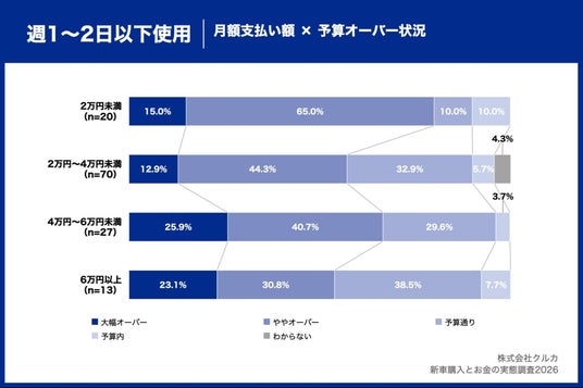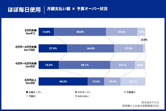 週3~4日使用×月額6万円以上を支払っている層では「大幅に予算オーバー」が57.1%と突出して高く、ほぼ毎日使用×月額6万円以上を支払っている(46.2%)を10.9ポイント上回りました。一方、週1~2日以下使用×月額6万円以上を支払っている層は「大幅に予算オーバー」が23.1%にとどまり、「予算通り」が38.5%で最多となっています。