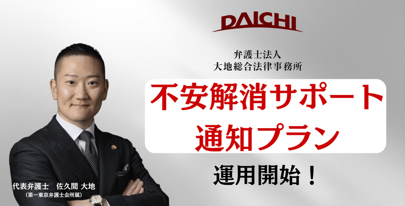 こうした状況を踏まえ、大地総合法律事務所では、この度「不安解消サポート通知プラン」を本格導入いたします。