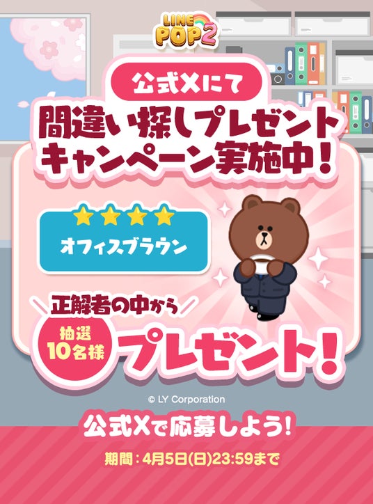 イベント期間中、「LINE POP2」公式X(旧Twitter)アカウントをフォローし、間違い探しの答えをリプライすると、正解者の中から抽選で限定ミニモン「★4 オフィスブラウン」が当たるキャンペーンを開催します。