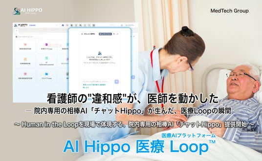 医療AIと病院AI PMOカンパニー、MedTech Group株式会社(本社:東京都港区、代表取締役社長 前田清貴、以下MedTech G社)と企業データとAIの利活用カンパニー、AIデータ株式会社(本社:東京都港区、代表取締役社長 佐々木隆仁、以下AIデータ社)は、医療現場における意思決定支援を目的としたAIプラットフォーム「AI Hippo 医療Loop」において、院内専用の相棒AI「チャットHippo」の提供を開始しました。
