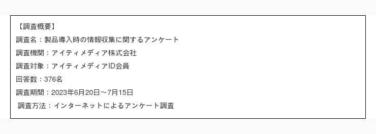 アイティメディア株式会社(本社:東京都千代田区、代表取締役社長:大槻利樹)デジマ調査ラボは、製品導入時の情報収集に関する調査結果を公開しました。多くのB2B企業が製品情報をWebサイトに掲載していますが、そういった情報を企業の製品導入経験者が実際にどのように取得・活用しているかを調査し、今後のマーケティング活動の参考とするため、2023年6月~7月にかけてWeb上でアンケートを行いました。