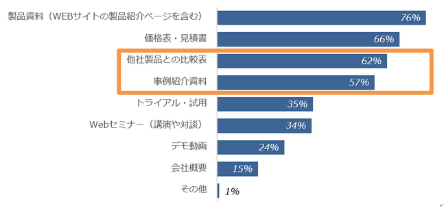 導入したい製品の検討候補が複数ある場合に、どんな情報が候補を絞るか聞いてみたところ、「製品資料(WEBサイトの製品紹介ページを含む)」「価格表・見積書」という回答に続き、5割を超える回答者が「他社製品との比較表」「事例紹介資料」を選択したことがわかりました。