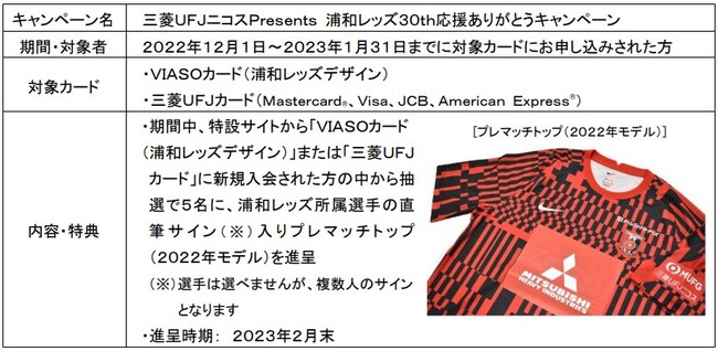 三菱UFJニコスは12月1日から来年1月31日まで、「VIASOカード(浦和レッズデザイン)」および「三菱UFJカード」の新規入会特典として、浦和レッズ所属選手の直筆サイン入りプレマッチトップ(試合前に着用するウォームアップシャツ)を抽選で進呈する「三菱UFJニコスPresents 浦和レッズ30th応援ありがとうキャンペーン」を開催します。
