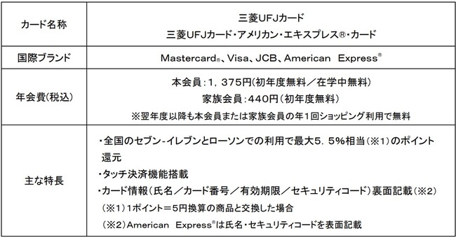 ・「三菱UFJカード」は、タッチ決済やカード情報裏面表示による利便性・安全性に加え、コンビニでのポイント優遇などお得感のある、当社のフラッグシップカード。