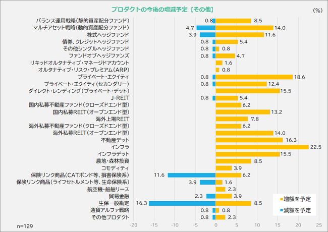 債券・クレジット系プロダクトでは国内債券の減額予定が目立つほか、金利上昇、為替ヘッジコストが影響してヘッジ外債の投資ニーズが減衰しています。一方で、アクティブ運用や債券アンコンストレインド運用については根強いニーズも確認できました。