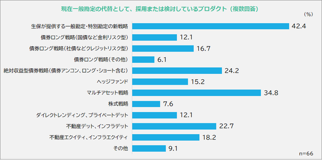 生保一般勘定を代替する選択肢としては、生保が提供する代替戦略、マルチアセット戦略、債券アンコンストレインド戦略、不動産・インフラのデット戦略などが検討されています。