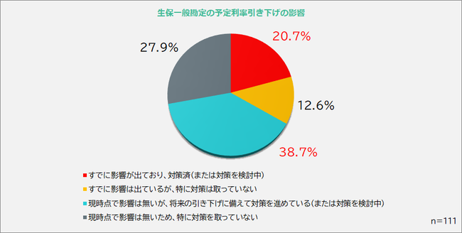 相次ぐ生保一般勘定の予定利率引下げの動きに対して、全体の16.3%が今後の減額・解約を予定していると回答しました。また、一般勘定を採用する企業年金の59.4%では現在何らかの対策が進んでいます。