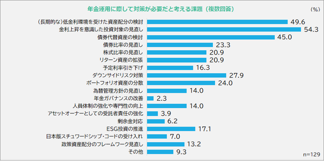 年金運用上の課題では、「足もとの金利上昇」「長期的な低金利」「ダウンサイドリスク」への対策が上位に(下図参照)。「足もとの金利上昇」「長期的な低金利」の両方を選択する企業年金も多く、低金利にともなう利回り低下と、金利上昇による債券価格下落の板挟みの状態にあるようです。