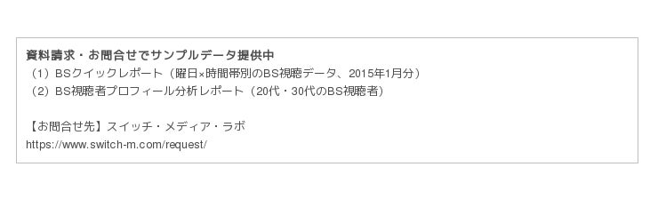 メディアリサーチの株式会社スイッチ・メディア・ラボ(本社:東京都港区、代表取締役:福羽泰紀)は、BSデジタル放送(無料放送)の視聴状況を、広告主や出稿を検討している企業へ、速報レポートとしてデータ提供する「BSクイックレポート」をサービス開始いたします。