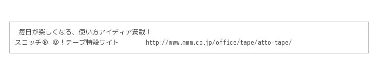 テープの上から鉛筆でも字が書ける、乳白色のメンディングテープでおなじみのスコッチ(R) ブランドから、デザインテープ「スコッチ(R) @!テープ」が装いも新たに登場。テープの幅が18mmと36mmの2サイズ、新しいデザインも加わり、全15種類で展開します。文字が書けるデザインテープというユニークさに加え、テープの基材がアセテート・フィルムなので、仕上がりが美しいだけでなく、しっかり貼れる粘着力で、封かんなど様々なシーンに活用いただけます。ペタッと貼るだけで、メッセージや気持ちがつたわる、ラッピングでいろどる、ユニークなデザインテープです。