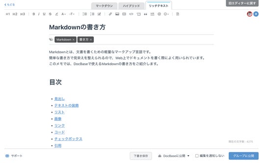 DocBaseは「チームの成長を加速する」をコンセプトに、日々開発を続けてきました。チームの成長を加速させるには、誰でも使いやすいツールであることが必要不可欠です。しかしながら、以前のDocBaseはMarkdown記法しか使えず、非エンジニアが使うにはハードルが高いものでした。