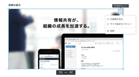 画像サイズをドラッグで編集でき、サイズの数値指定にも対応しています。画像編集は今後も機能を追加していく予定です。