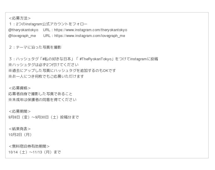 ※今回応募いただいた写真は@theryokantokyo、@lovegraph_me及びTheRyokanTokyo Webサイト、Lovegraph Webサイト等に公開する可能性があります。また、その際に加工やトリミングを行うことがあります。