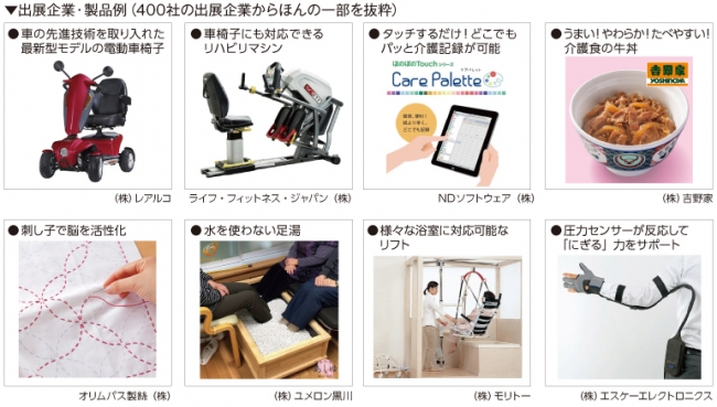車椅子などの介護用品や電動ベッド、入浴装置などの設備はもとより、リハビリ機器、最新IoT技術を使った見守りシステムや介助ロボット、食事サービスやレクリエーション素材など、様々な分野の企業が出展します。