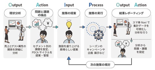 さらに、既存サービス「スマ券Navi(開発中)」のデータを活用し、売上とゲスト属性の関係を詳細に分析します。この分析結果に基づき、セグメント別の課題を設定し、PDCAサイクルを提案・管理していきます。これにより、新規ゲストの開拓と既存ゲストとの関係性強化・改善を効果的にサポートします。