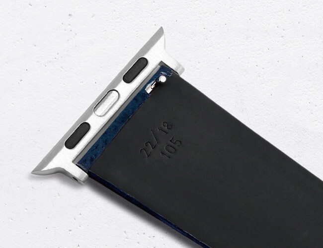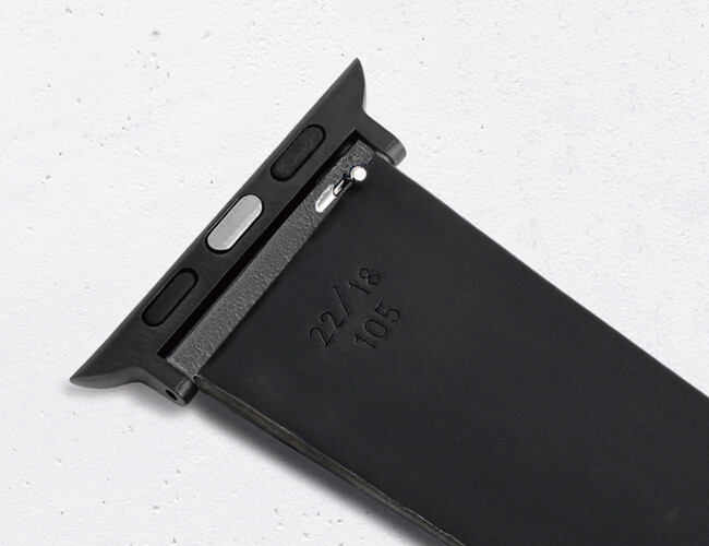 付属しているアダプターは、バネ棒タイプが取り付けてあります。レバーになっているツメ部分を指先でスライドし、アダプターからベルトの付け外しや取り替えがワンタッチで行えます。時計ベルト胴元幅22mmと同サイズにより、アップルウォッチ用ストラップと時計ベルトの両方に付け替え可能です。
