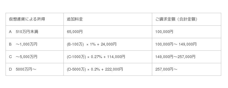 基本料金35,000円(税込)プラス、所得金額に応じた以下の価格