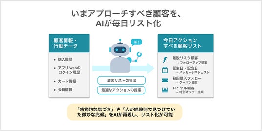 本サービスは、顧客データベースをAIが毎日走査し、「いまアプローチすべき顧客」リストを自動で作成。アプローチすべき理由や最適な提案内容(メッセージ文例やオファー案)までをサジェストすることで、理想のOne to Oneマーケティングの実行精度を飛躍的に高めることが可能です。